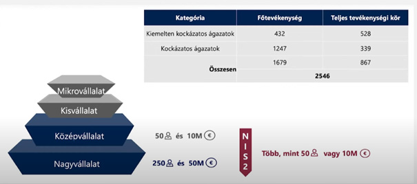 Az érintett ágazati vállalatok és szervezetek közép és nagyvállalat méretűek, 50 fő foglalkoztatott felett és 10 millió euro éves árbevétel fölöttiek. Ez vagylagos, nem kell mindkettőnek érvényesülnie. A szervezetek minősítése a Kkvtv. 5. § (3) szerint történik. A hatóság kijelölheti ezeknek a cégeknek a beszállítóit és közreműködőit is, akik infokommunikációs szolgáltatást nyújtanak az érintett gazdálkodó szervezeteknek.