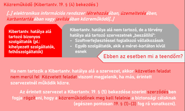 19. § (4) Ha az érintett szervezet az elektronikus információs rendszer létrehozásában, üzemeltetésében, karbantartásában vagy javításában közreműködőt vesz igénybe, a (3) bekezdés szerinti követelményeknek a közreműködő esetében is teljesülniük kell.
